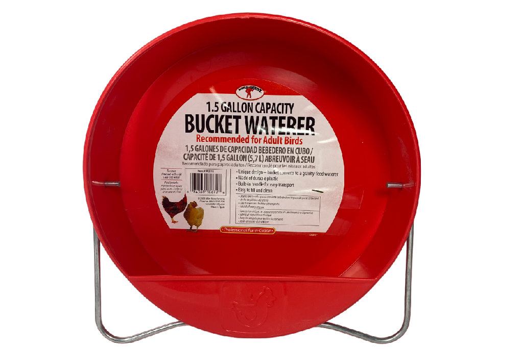 The unique design serves as a bucket for filling and carrying, then converts to a gravity-fed waterer. Lid is removable for easy filling and cleaning. 1.5-gallon size with built-in handle is perfect for small poultry flocks. Recommended for adult birds.
