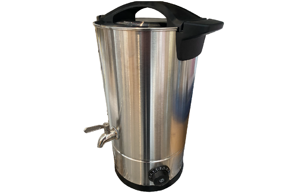 Stainless steel wax melter with a 10-12lb capacity. It has a temperature thermostat that ranges from 30C-110C, and a drain valve for filling molds easier.